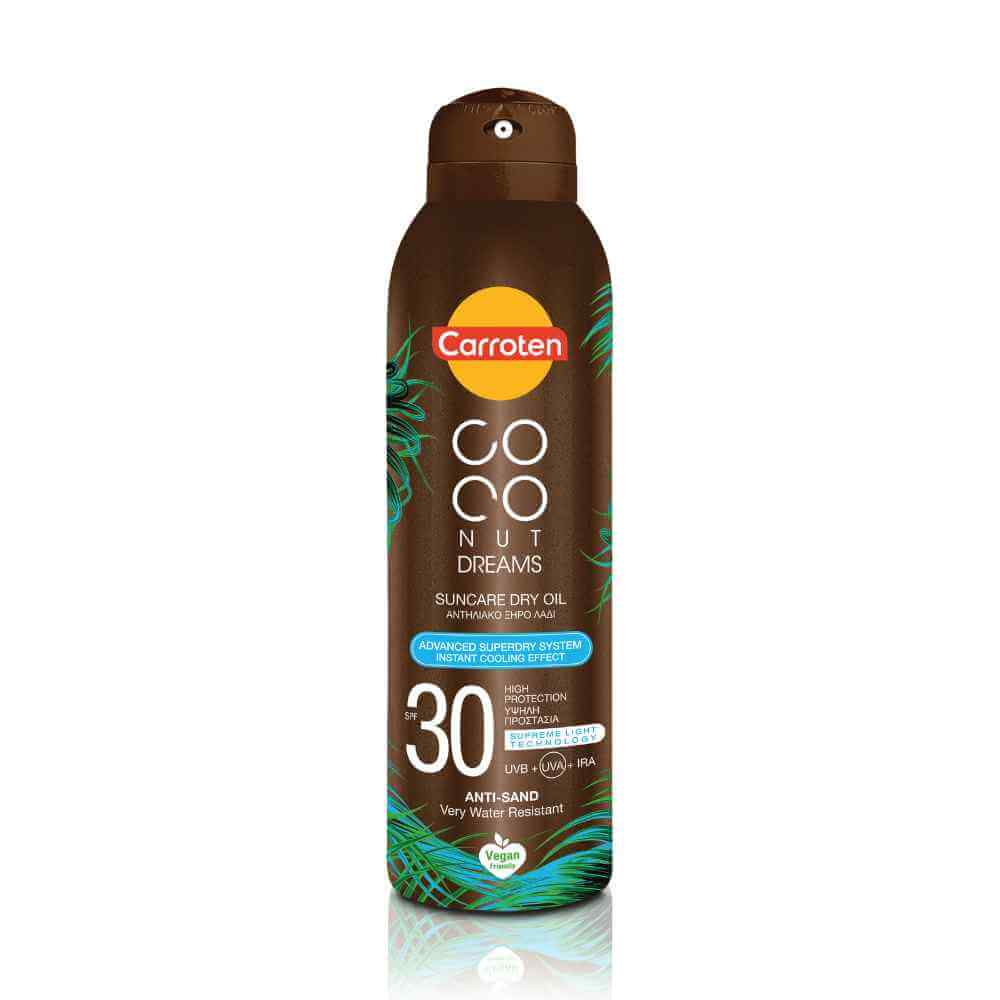 Carroten Suncare Dry Oil SPF30 Coconut Dreams er en effektiv og solbeskyttende tør-olie på spray, der har en fantastisk "Anti-sand" teknologi, hvilket efterlader huden glat og dejlig - uden at fedte!