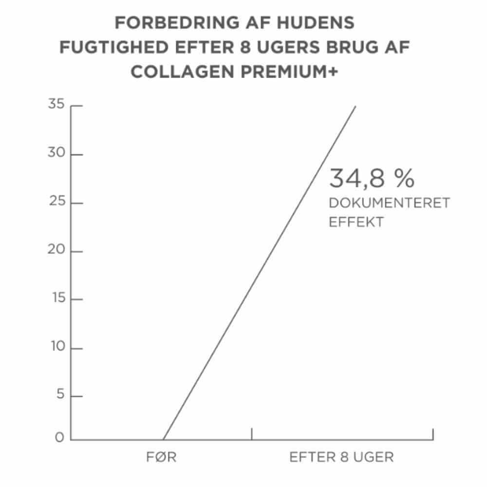 Vores Collagen Premium+ er dokumenteret til at reducere synligheden af rynker og cellulite samt øge hudens fugtniveau med op til 35 % efter kun 8 uger. Dets mikrohydraliserede marint TYP1-kollagen styrker din huds naturlige struktur og bidrager til et yngre og friskere udseende.
