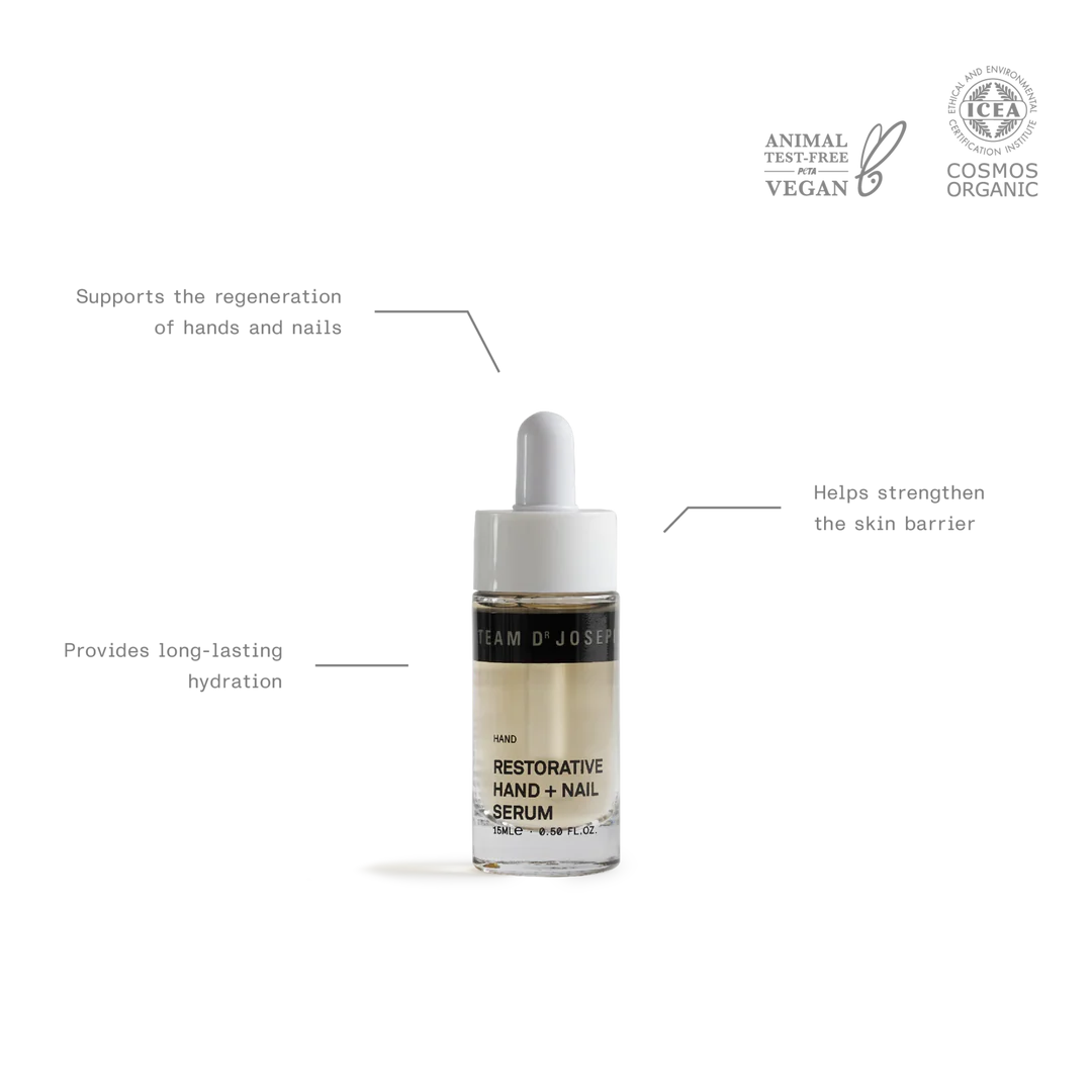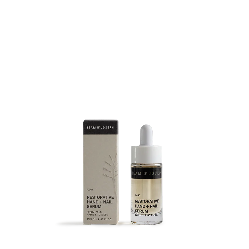 Team Dr Joseph – Restorative Hand + Nail Serum er et let, men intensivt fugtgivende hånd- og negleserum, der er udviklet til tørre, belastede hænder og skøre negle. Med hyaluronsyre, mandelproteiner, figenkaktus, kamille og aloe vera hjælper serummet med at regenerere, berolige og styrke både hud og negle – uden at efterlade en fedtet overflade.
