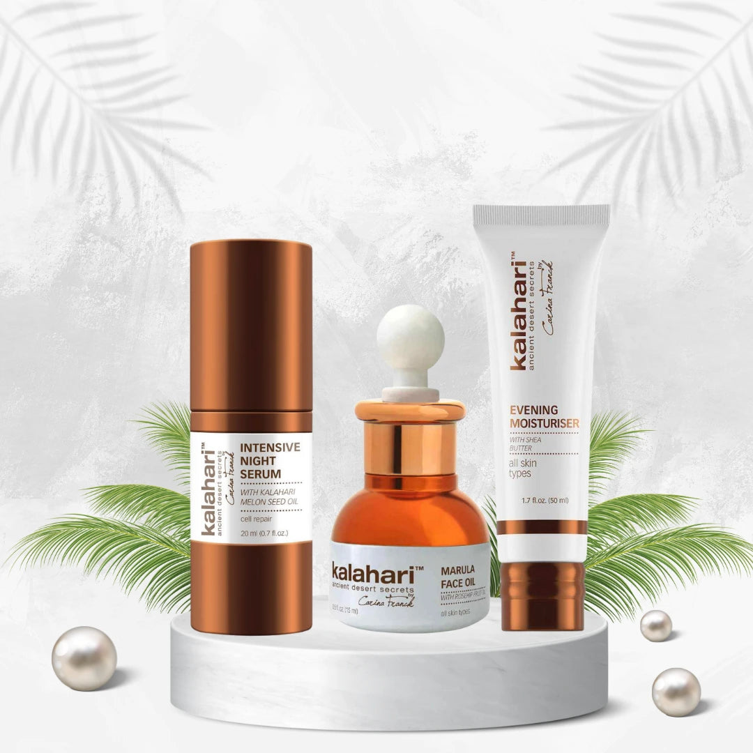 The Evening Recovery Ritual fra Kalahari er et luksuriøst natplejesæt, der arbejder aktivt, mens du sover. Kombinationen af nærende olie, intensivt serum og fugtgivende natcreme styrker hudens naturlige regenerering, beroliger og efterlader huden frisk, blød og fornyet ved morgengry.