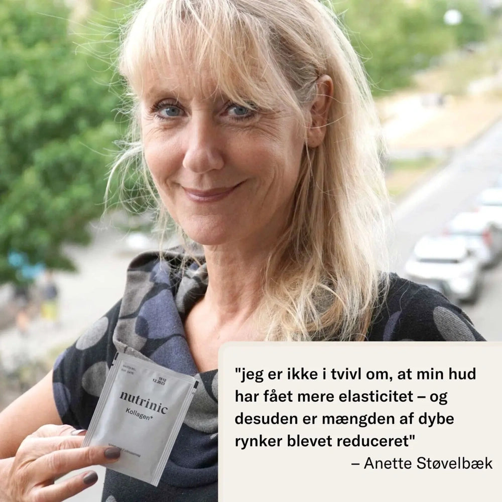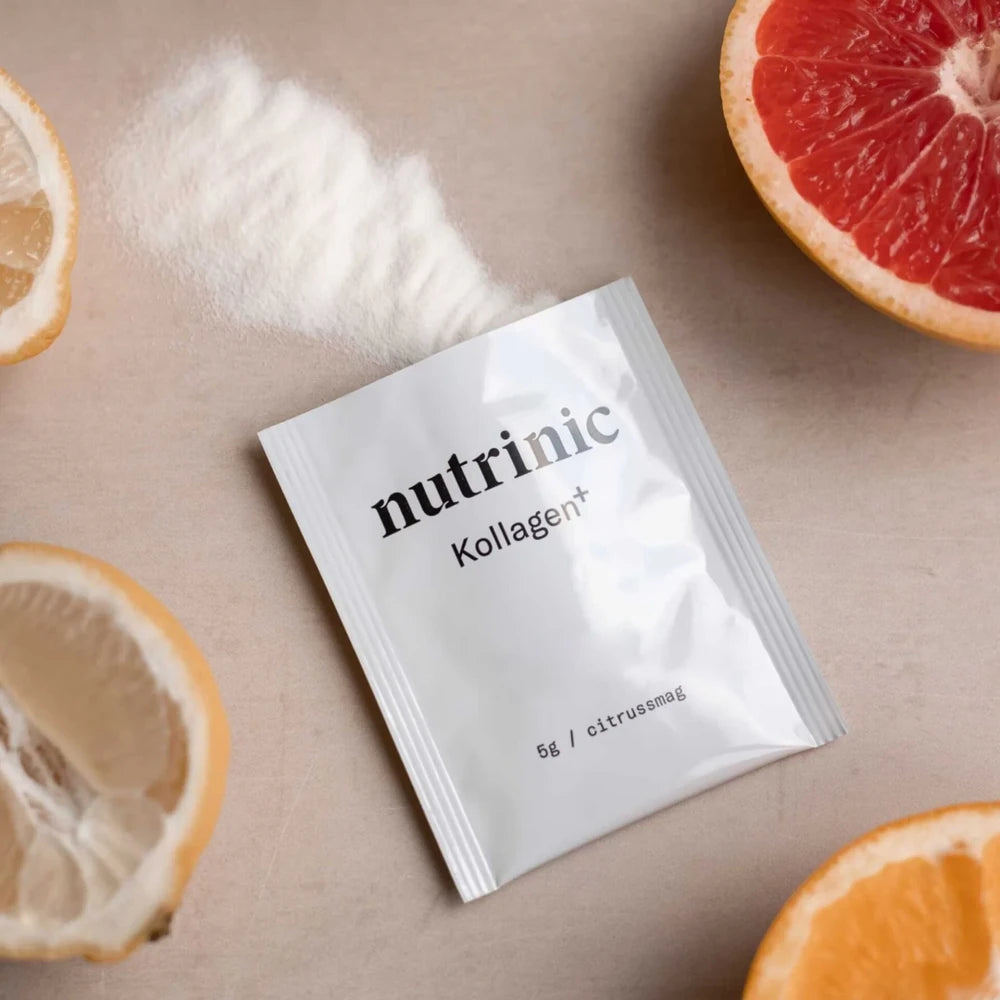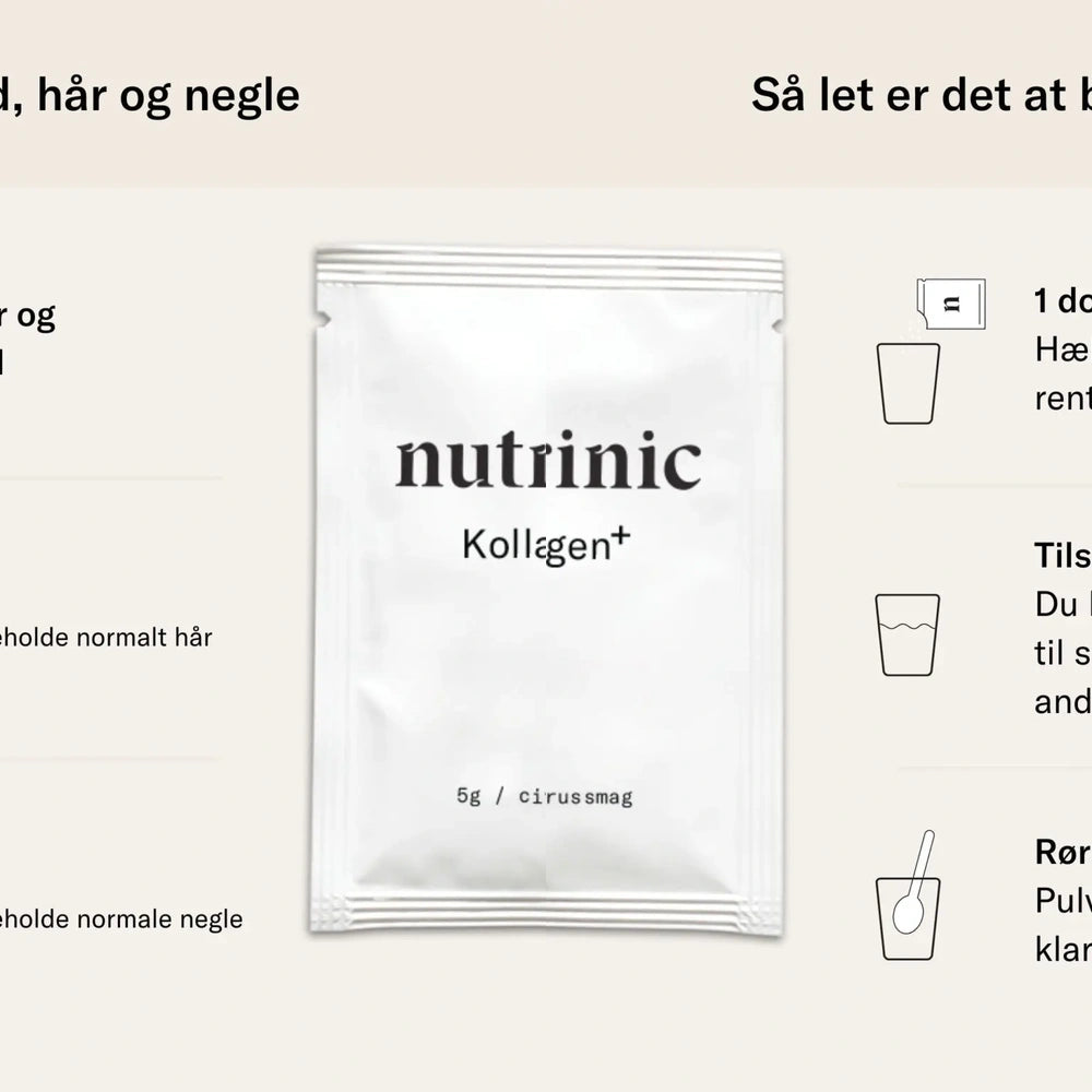 Nutrinic Kollagen+ er til dig, der ønsker et gennemført kollagentilskud til din daglige skønhedsrutine – uden at det bliver besværligt. Kollagenet er pakket i smarte doseringsbreve, opløses nemt og fås med naturlig citrussmag eller hindbærsmag. En pakke indeholder 30 breve, så du har en enkel rutine, der er let at holde – også når du er på farten.